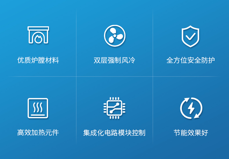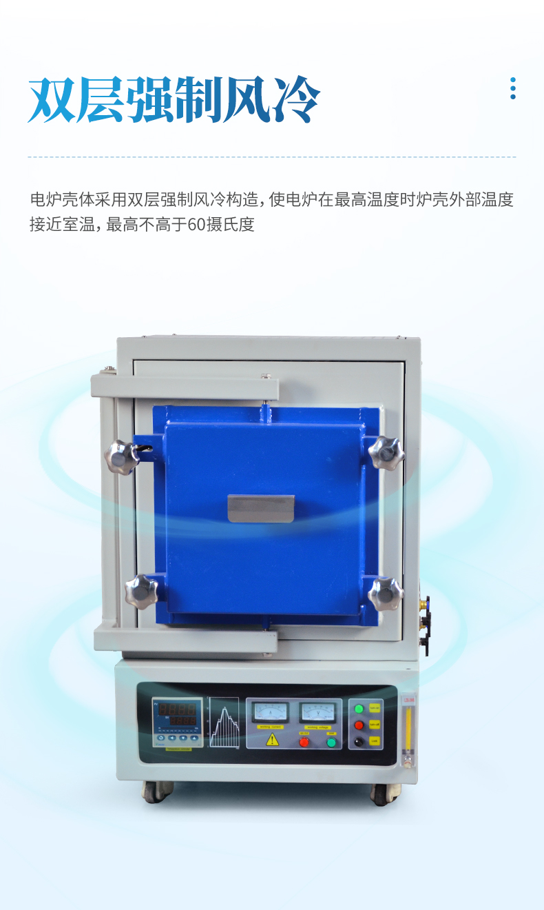 電爐殼體采用雙層強制風冷構造,使電爐在最高溫度時爐殼外部溫度接近室溫,最高不高于60攝氏度。