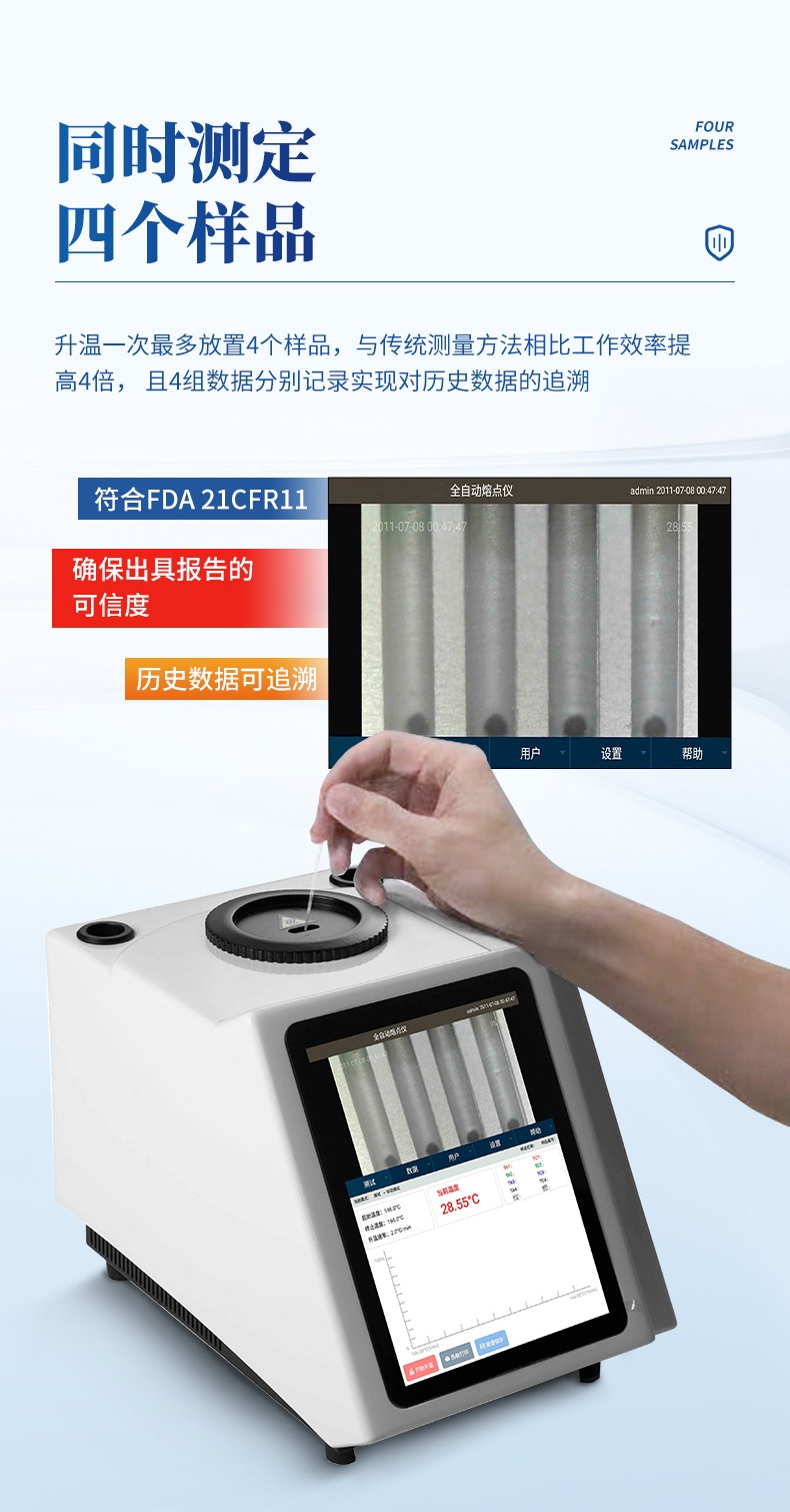 升溫一次最多放置4個樣品,與傳統測量方法相比工作效率提高4倍,且4組數據分別記錄實現對歷史數據的追溯,符合FDA 21CFR11確保出具報告的可信度。