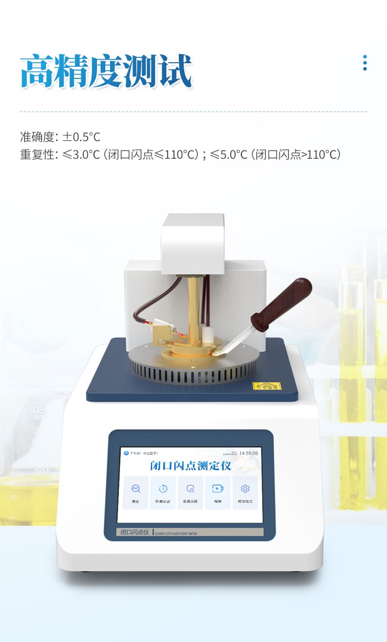 閉口閃點全自動測定儀,主要用于石油產品閉口閃點值的測定,儀器采用ARM微處理器技術、7寸彩色觸摸屏技術、中文菜單,人機交互更方便;儀器具有掉電存儲功能;儀器具有自動點火、顯示、鎖定并打印結果、自動冷卻等功能;儀器具有測量準確、重復性好、性能穩定可靠,操作簡單的優點。廣泛應用于電力、石油、化工、商檢、科研等部門,符合ASTM D93 、GB/T 261-2008標準方法要求。