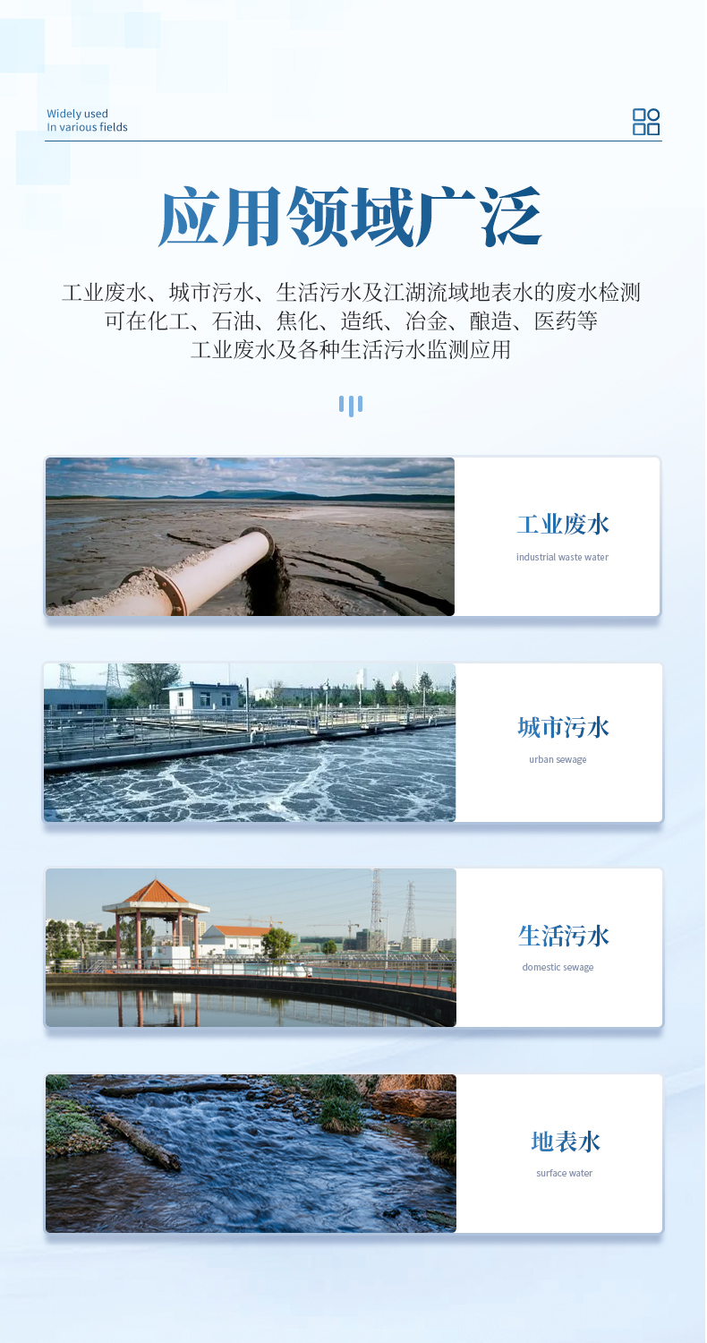 能夠廣泛的應(yīng)用于各種行業(yè)(工業(yè)廢水、城市污水、生活污水及江湖流域地表水)廢水的檢測,可適合不同用戶的多種需求,可在化工、石油、焦化、造紙、冶金、釀造、醫(yī)藥等工業(yè)廢水及各種生活污水監(jiān)測應(yīng)用。