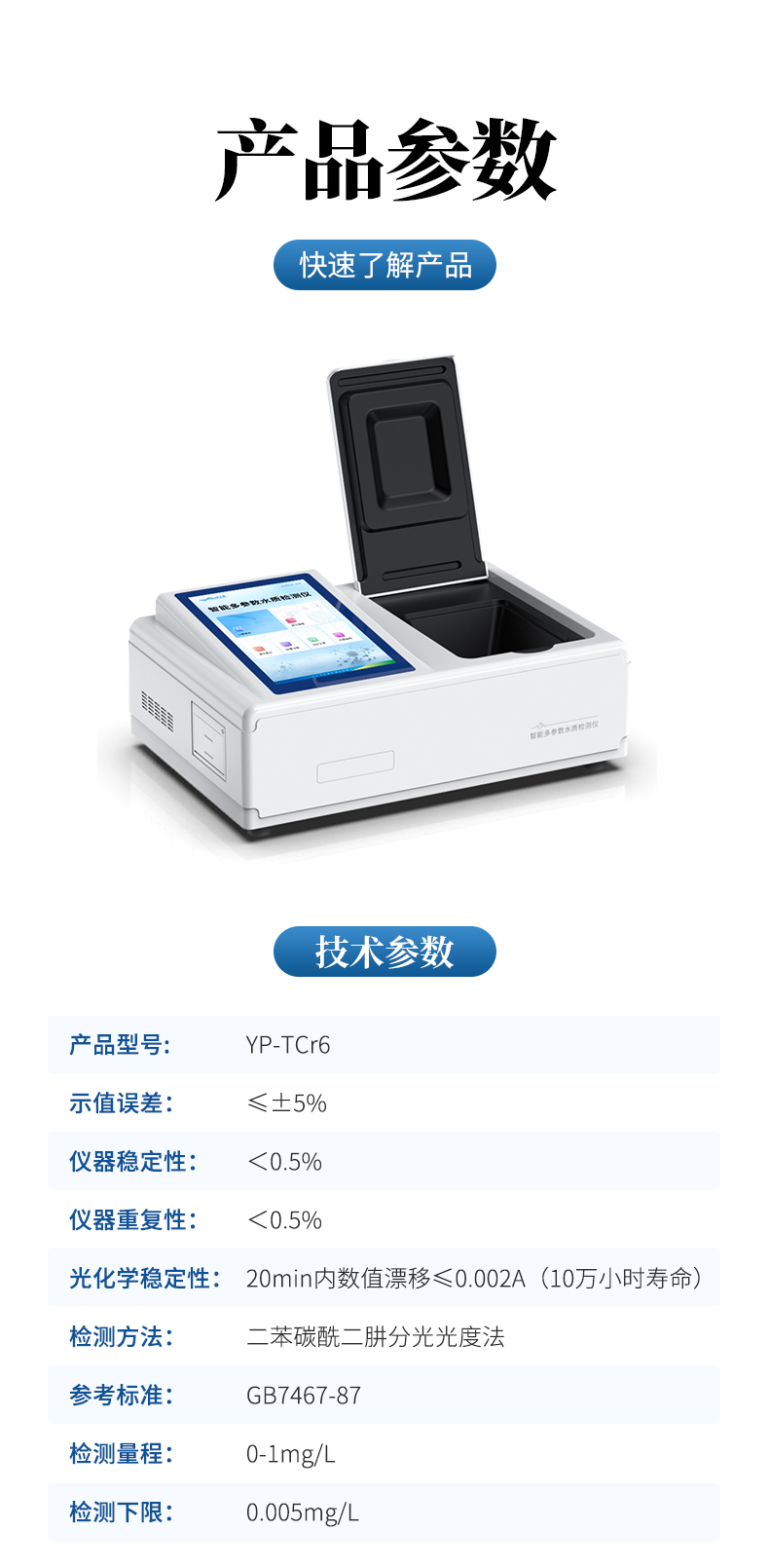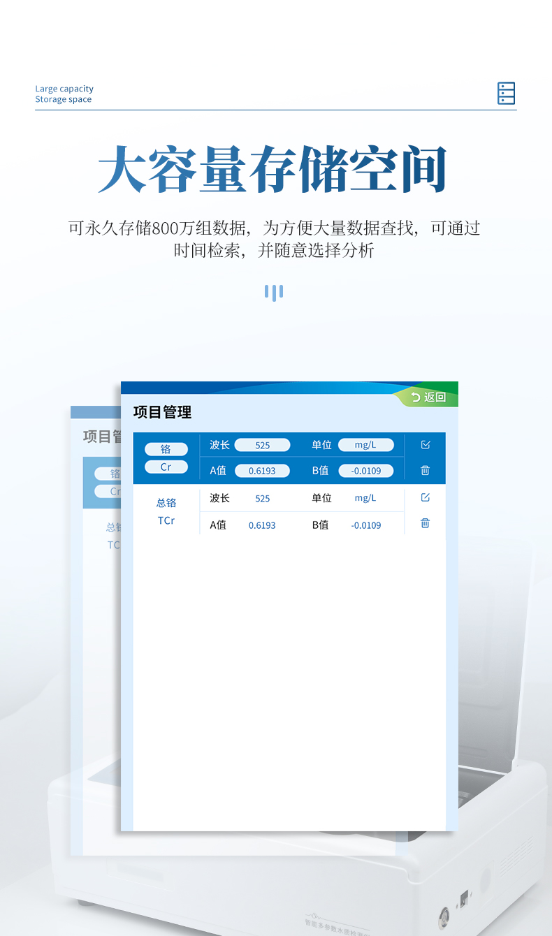 主要檢測水質(zhì)六價(jià)鉻重金屬含量指標(biāo),兼具智能數(shù)據(jù)分析功能,圖表、列表顯示數(shù)據(jù),分析一目了然;高清晰度彩色液晶觸摸顯示屏,Android智能操作系統(tǒng),中文顯示界面,中英文鍵盤,人性化操作,使用更簡單。