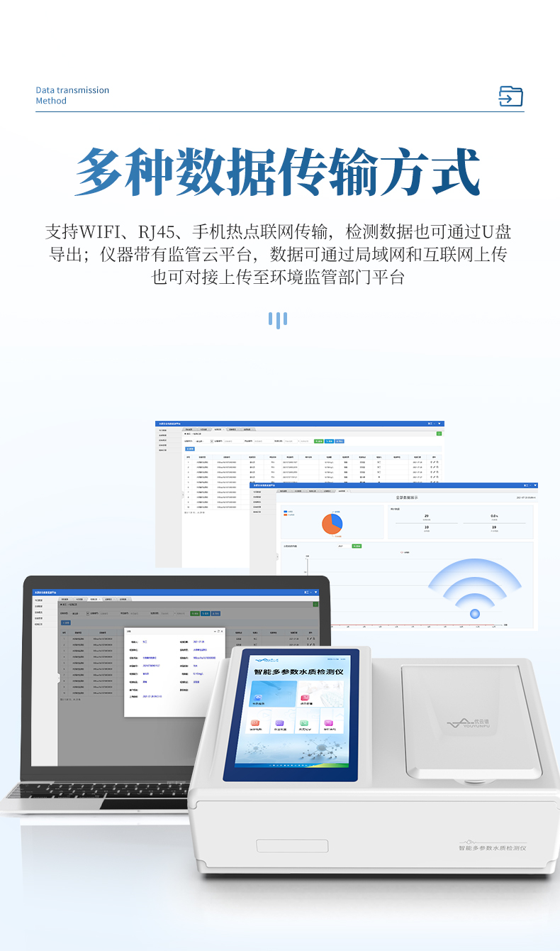 云平臺(tái):儀器帶有監(jiān)管平臺(tái),連接有線/無線網(wǎng)絡(luò),檢測結(jié)果直接傳輸至環(huán)境安全監(jiān)管平臺(tái)。
