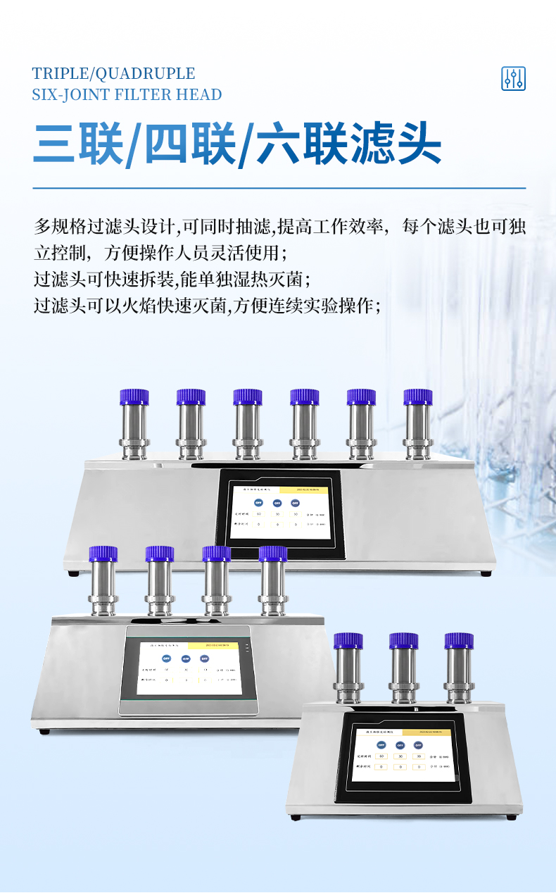 7.多規格過濾頭設計,可同時抽濾,提高工作效率,每個濾頭也可獨立控制,方便操作人員靈活使用;