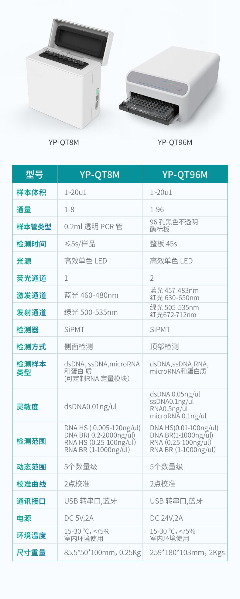 YP-QT1熒光計是款非常小巧的微量核酸定量及蛋白質濃度檢測設備,儀器采用熒光檢測原理,僅需1~20ul樣品即可獲得準確的檢測結果。檢測靈敏度高,檢測范圍廣,檢測時間短,是科研實驗室檢測低濃度核酸,蛋白質的完美工具,廣泛應用于NGS文庫構建中的DNA含量測定,PCR實驗中核酸濃度檢測等。