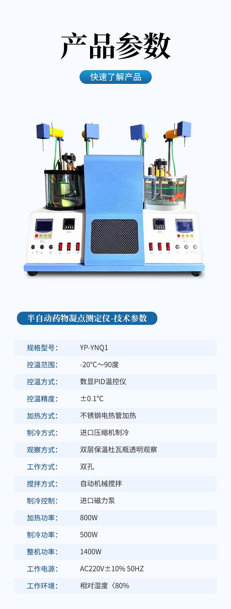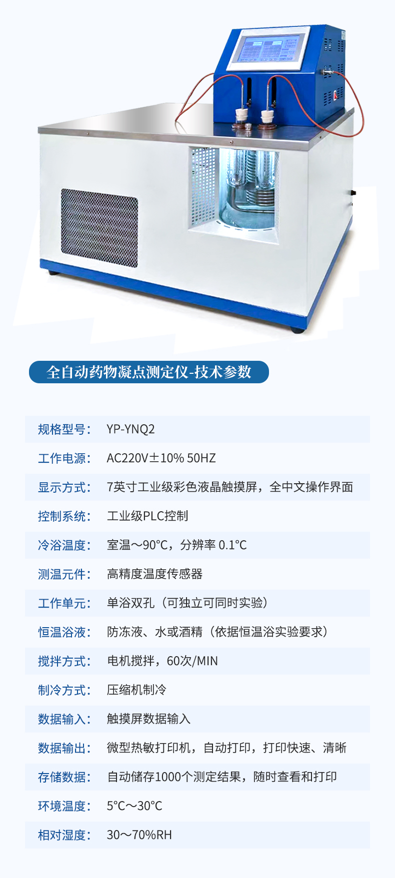 本儀器按《中華人民共和國藥典》2020年版四部 通則 0613凝點測定法要求設計制造,用于檢測化學試劑及藥物等凝固點。本儀器采用了模塊化設計,檢測部分采用了先進的傳感器,主控部分采用工業級PLC系統,控制性能穩定,制冷采用高性能壓縮機,具有降溫速度快,使用壽命長等優點。本儀器采用工業控制屏操作,樣品裝好后,一鍵開啟,自動往返式機械攪拌、自動顯示溫度曲線、自動判斷凝固點、自動打印測試數據。本儀器配有加熱和制冷,介質浴溫控范圍廣。