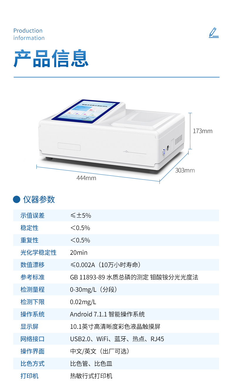智能總磷測定儀是參考《GB 11893-89 水質總磷的測定 鉬酸銨分光光度法》標準設計制造,主要檢測水質總磷濃度指標;