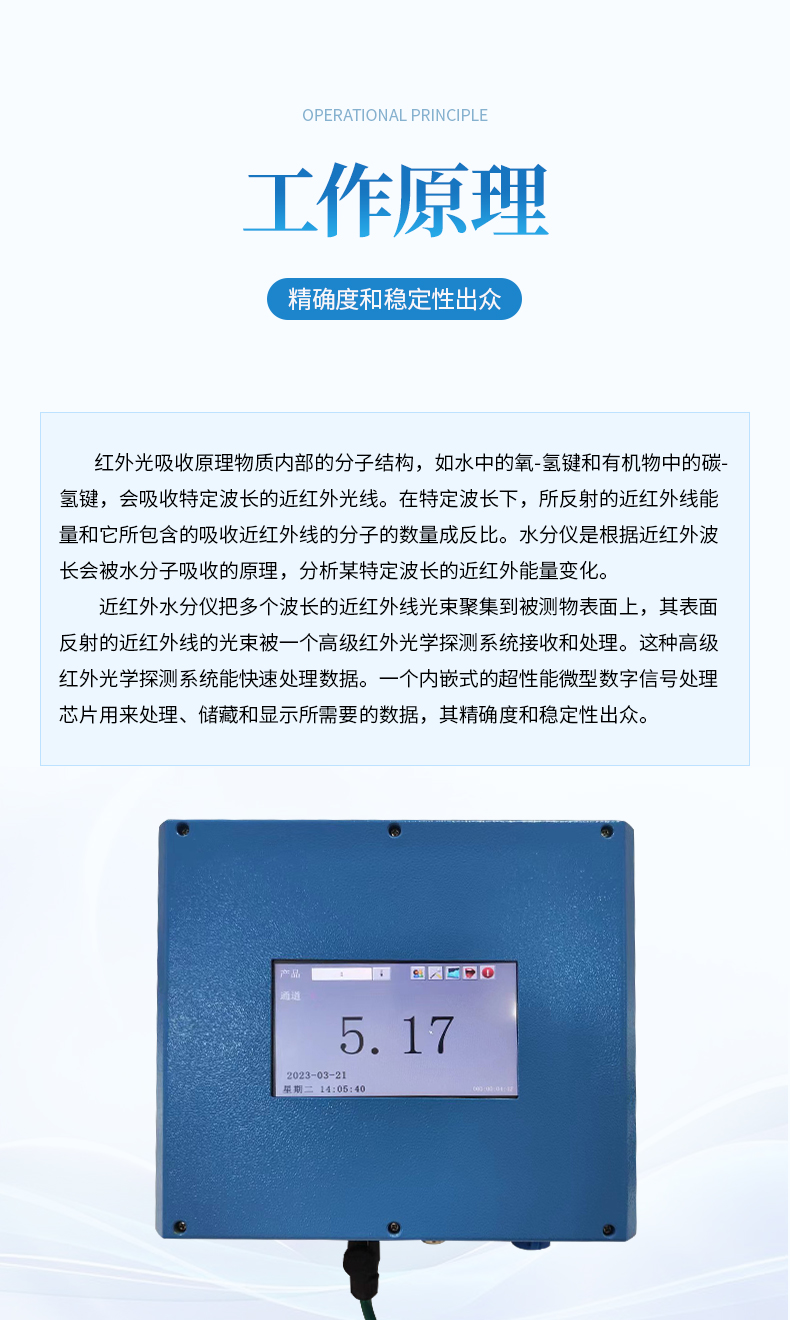 紅外光吸收原理物質(zhì)內(nèi)部的分子結(jié)構(gòu),如水中的氧-氫鍵和有機(jī)物中的碳- 氫鍵,會(huì)吸收特定波長的近紅外光線。在特定波長下,所反射的近紅外線能量和它所包含的吸收近紅外線的分子的數(shù)量成反比。水分儀是根據(jù)近紅外波長會(huì)被水分子吸收的原理,分析某特定波長的近紅外能量變化。
