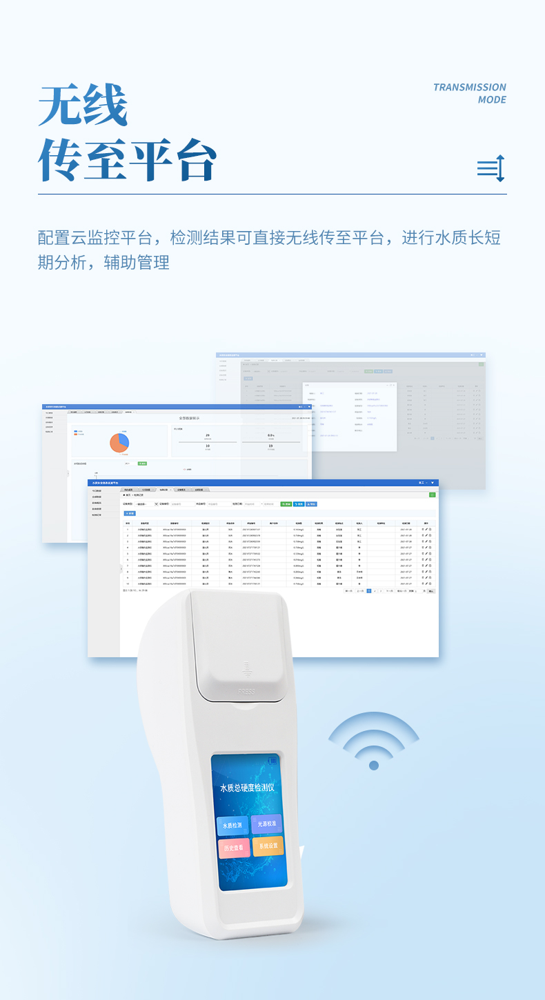 ②配置云監(jiān)控平臺,檢測結(jié)果可直接無線傳至平臺,進行水質(zhì)長短期分析,輔助管理。