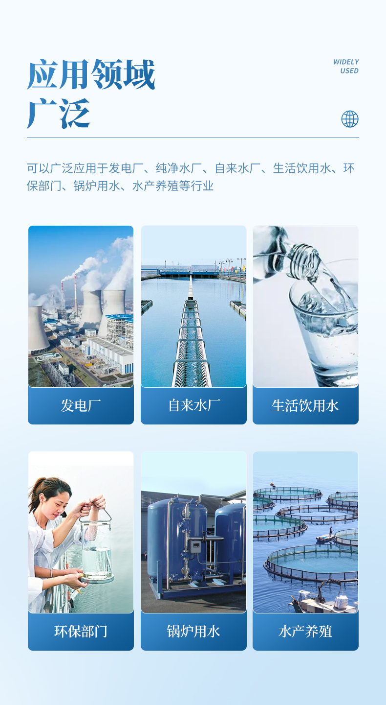 可以廣泛應(yīng)用于電力行業(yè)、工業(yè)用水、自來水廠、生活飲用水、石油化工、農(nóng)業(yè)灌溉、飲料食品制造業(yè)等行業(yè)。